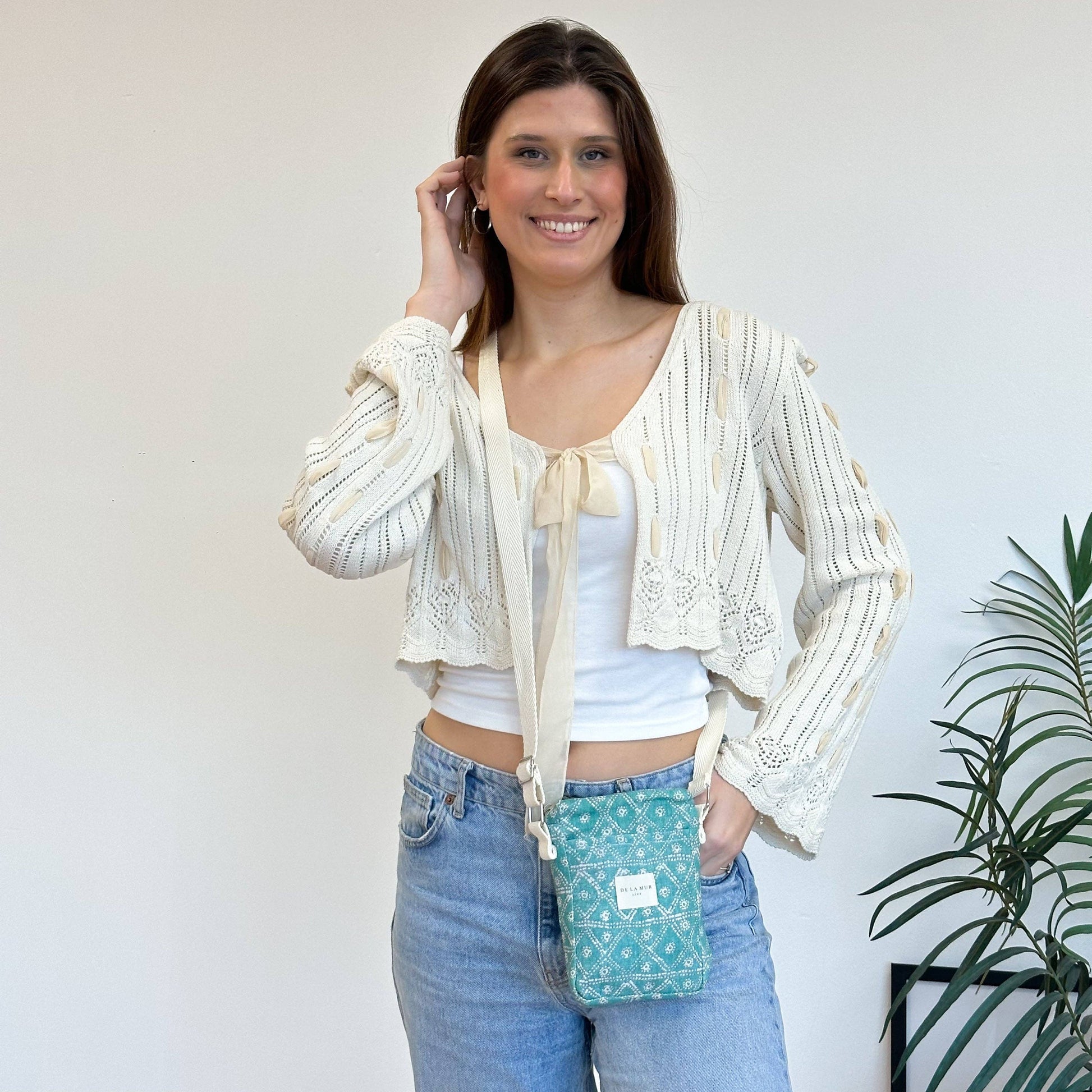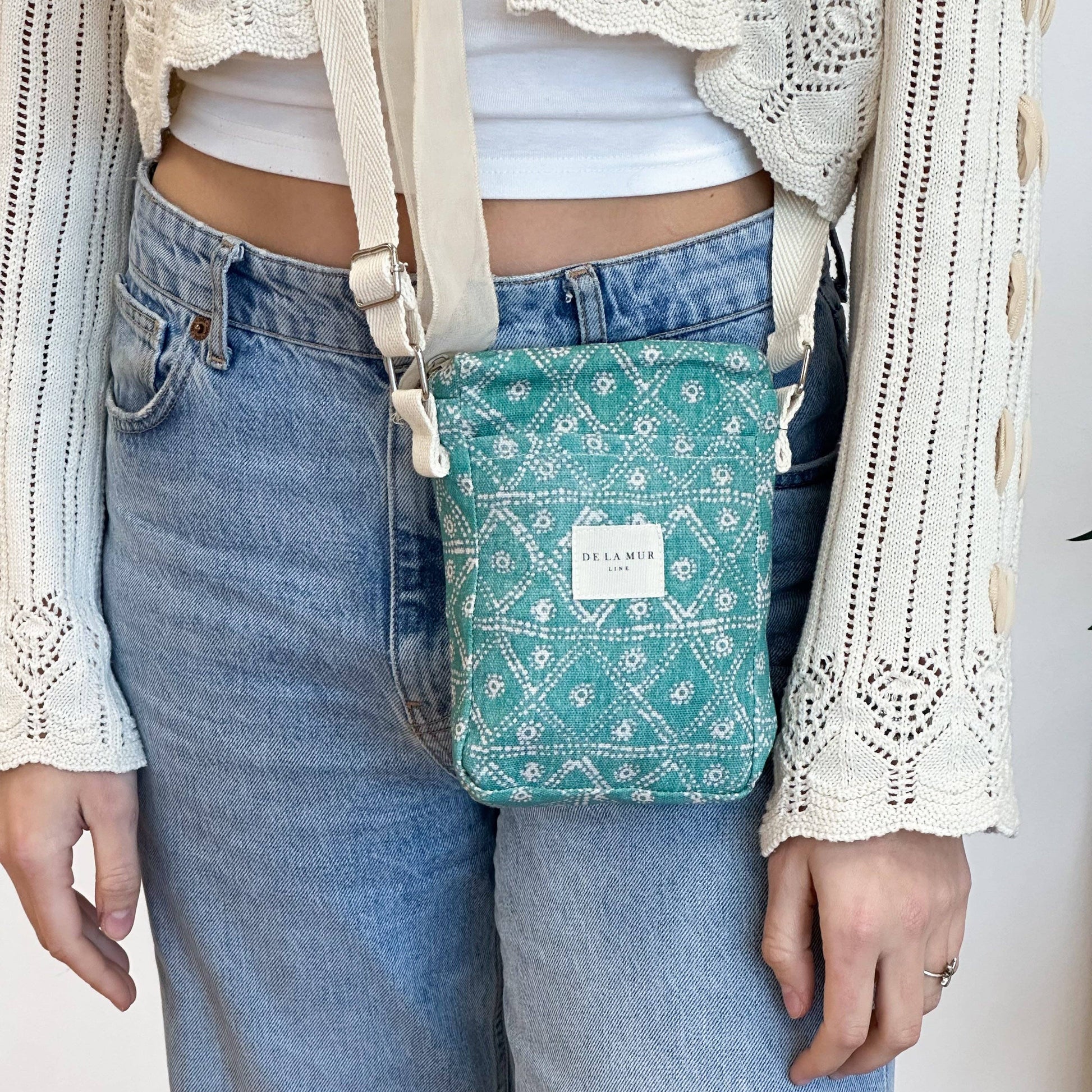Axelväska för mobil bärning, med dragkedja på toppen och justerbart långt handtag av ekru bomullsfiskbensrem. Ficka utan dragkedja på utsidan. Med tyg med geometriskt tryck i havsvattengrönt. Fodrad med tjockt grått tyg på insidan. För korrekt underhåll är det lämpligt att tvätta det i kylan för hand och inte använda en torktumlare.