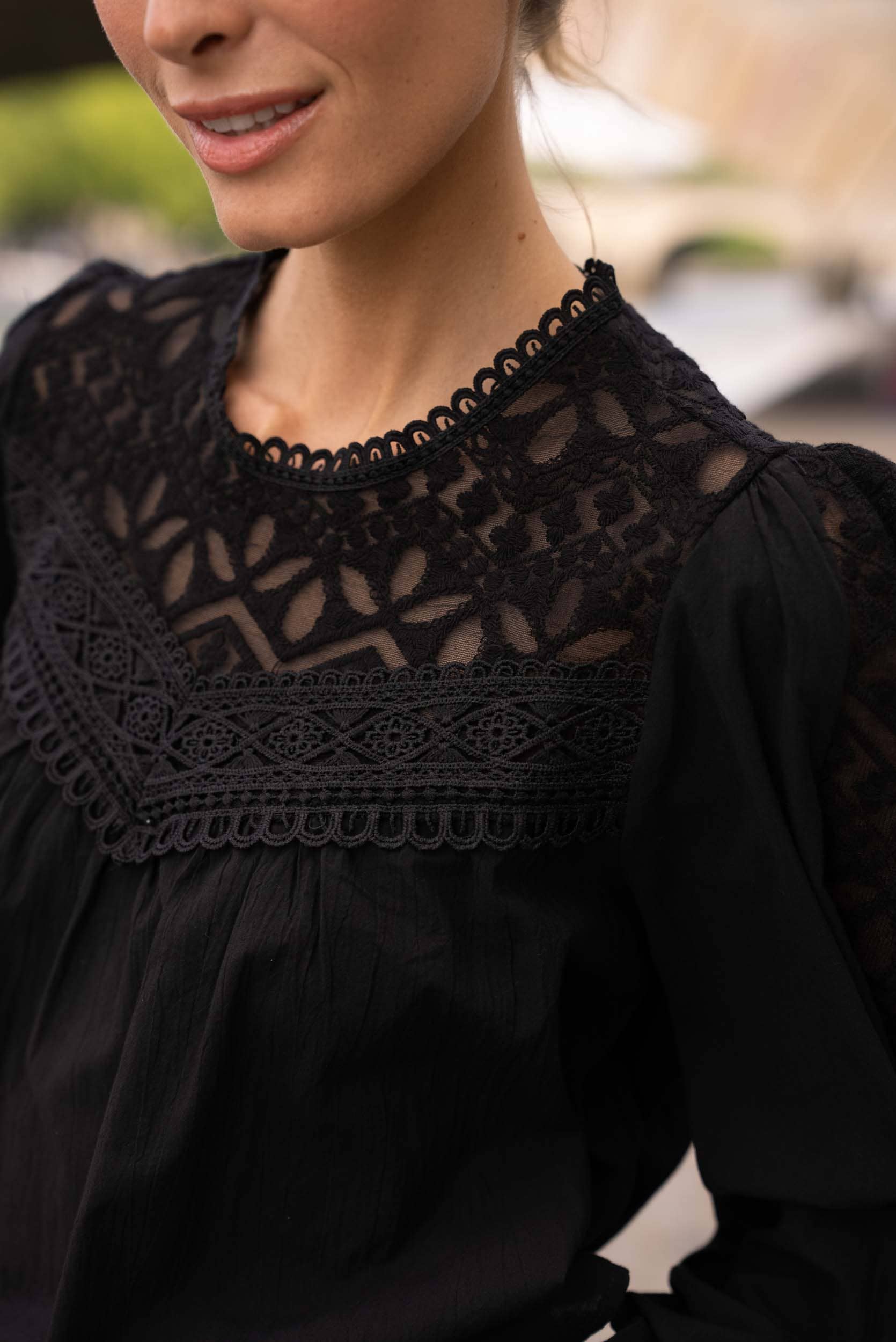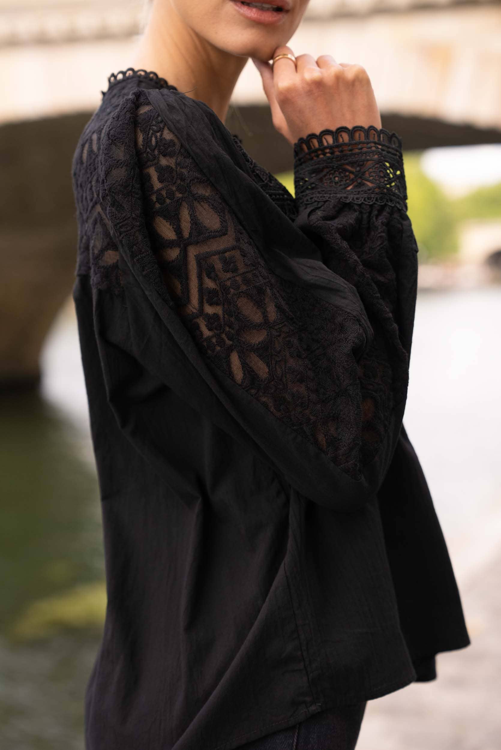 Bomull- och spetsblus: - broderad rund halsringning - halvtransparent spets framtill, bak och på ärmarna - oversize passform - knappar bak