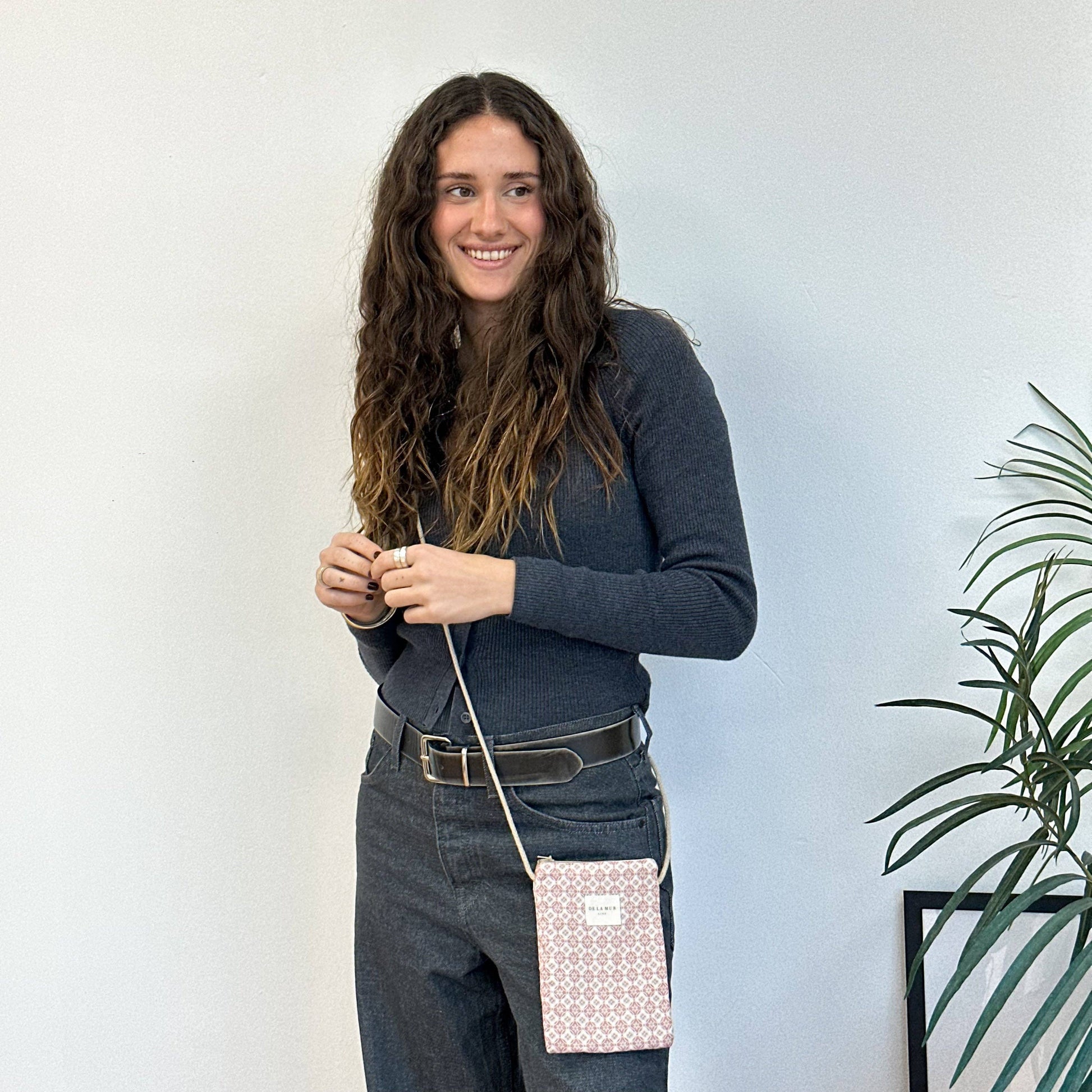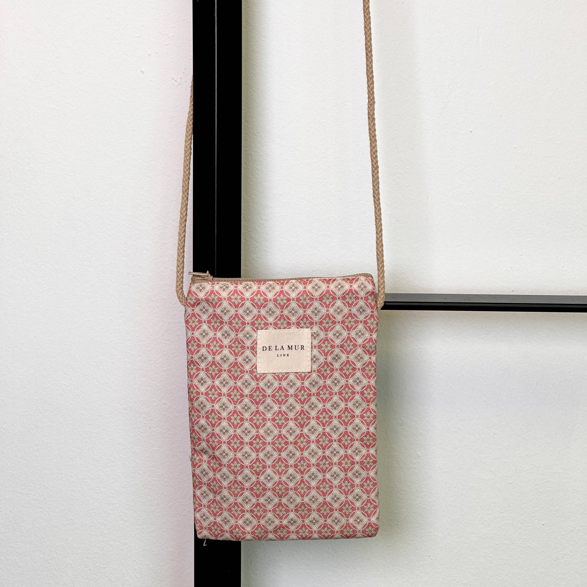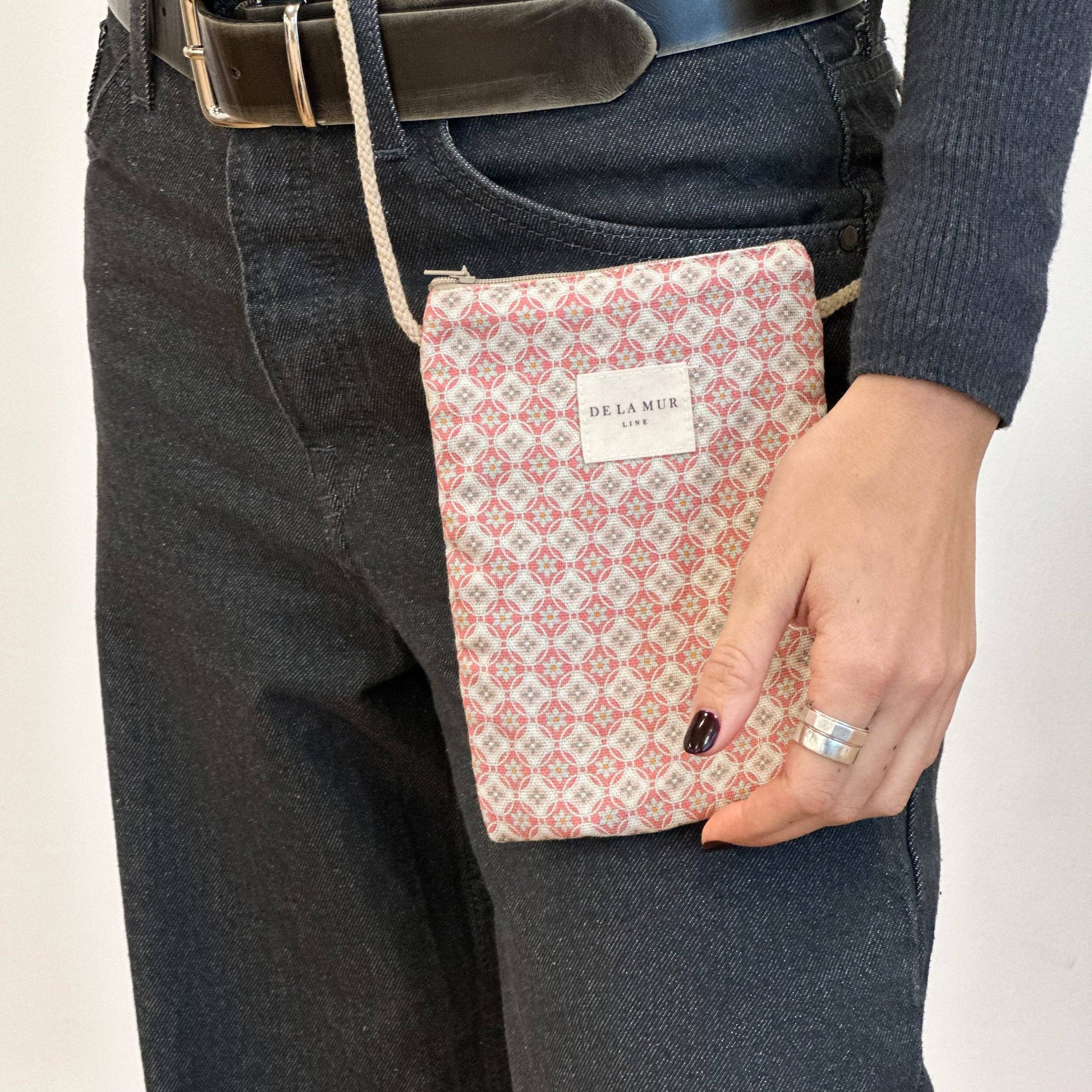 Mobil axelväska med dragkedja på toppen och lång beige bomullsdragsko. Med tyg med ett rosa geometriskt tryck. Fodrad med tjockt grått tyg på insidan. För korrekt underhåll är det lämpligt att tvätta det i kylan för hand och inte använda en torktumlare.