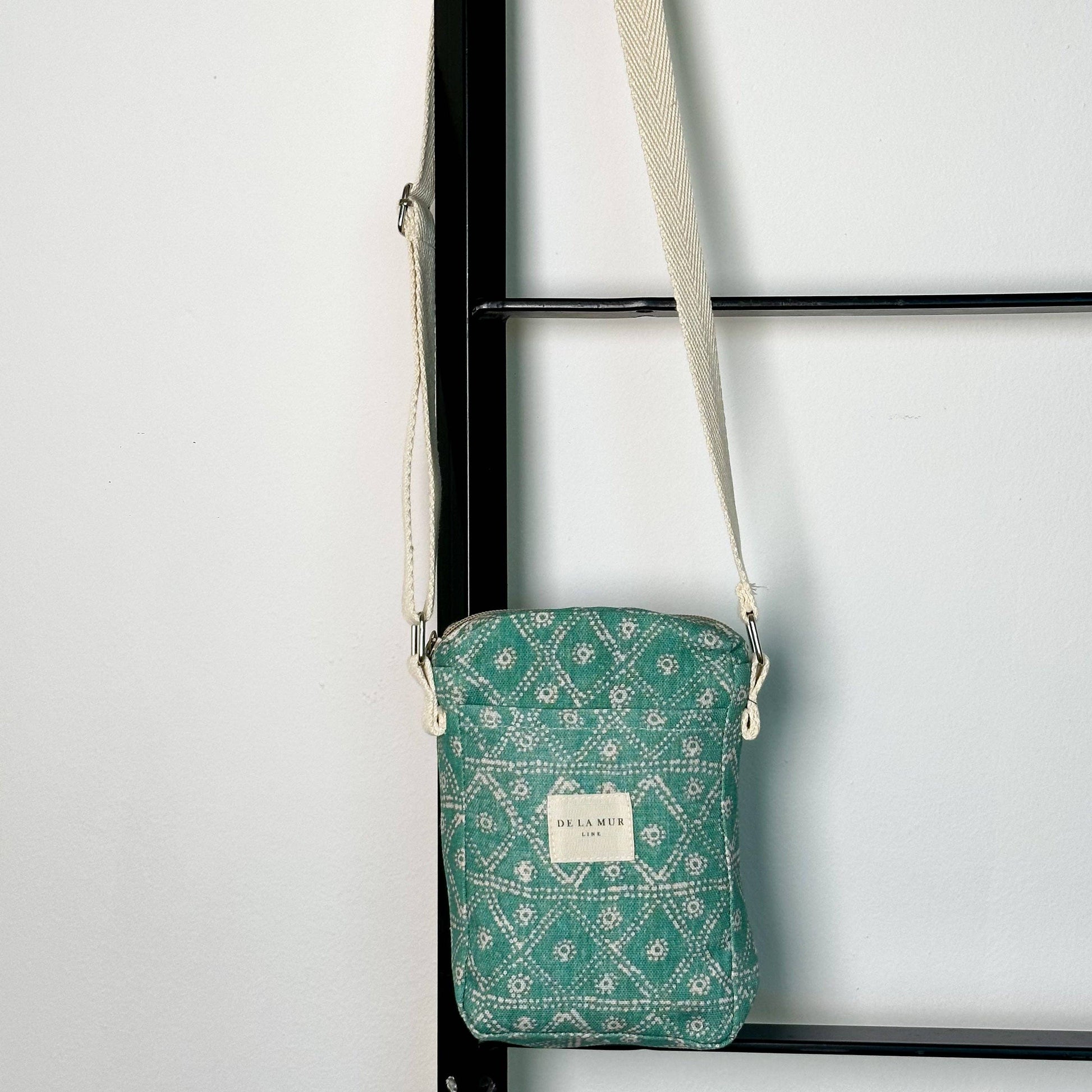 Axelväska för mobil bärning, med dragkedja på toppen och justerbart långt handtag av ekru bomullsfiskbensrem. Ficka utan dragkedja på utsidan. Med tyg med geometriskt tryck i havsvattengrönt. Fodrad med tjockt grått tyg på insidan. För korrekt underhåll är det lämpligt att tvätta det i kylan för hand och inte använda en torktumlare.