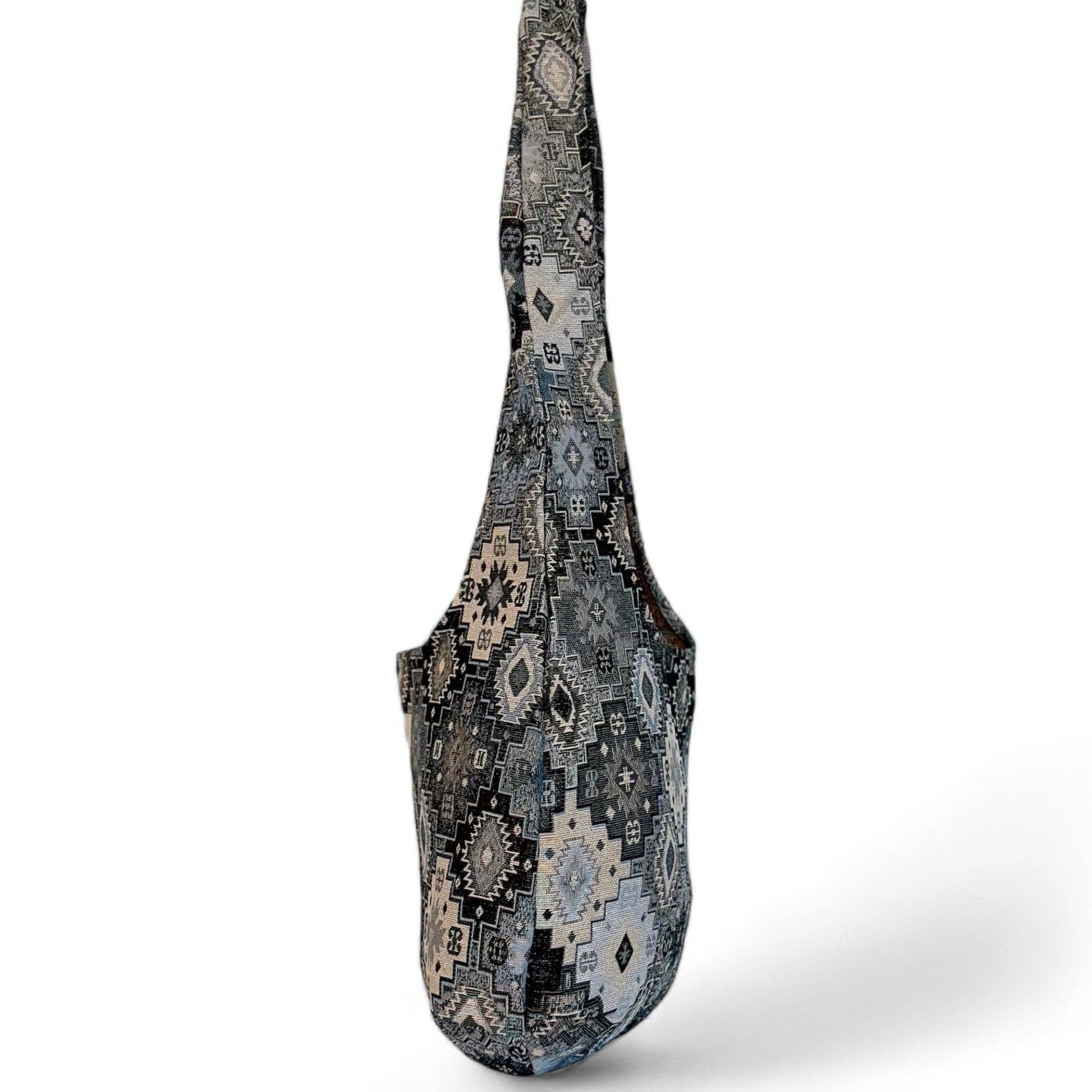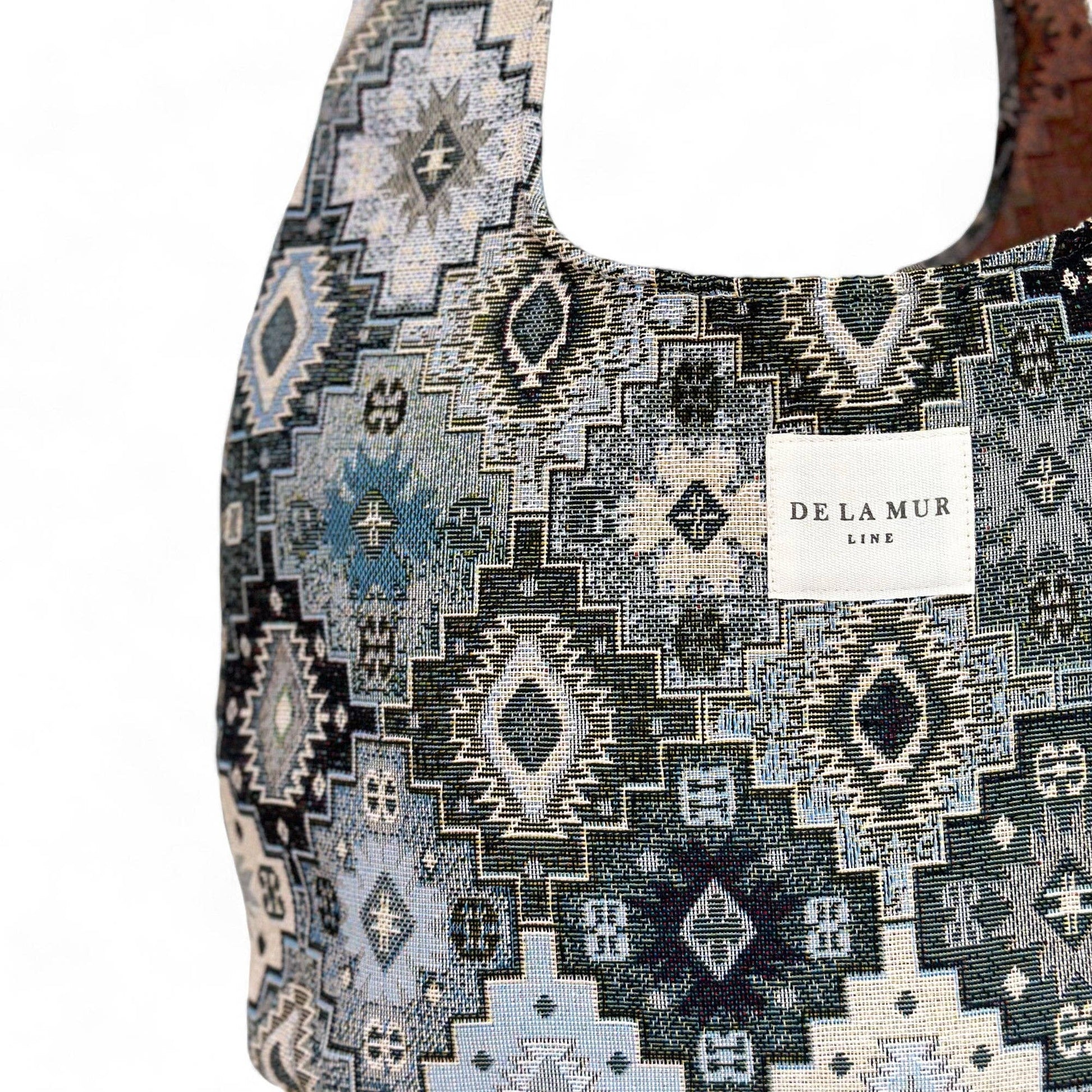 Oval väska med handtag att bära över axeln. Med ett tjockt jacquardtyg med etniskt tryck i nyanser av blått och grått. För korrekt underhåll är det lämpligt att tvätta det i kylan för hand och inte använda en torktumlare.