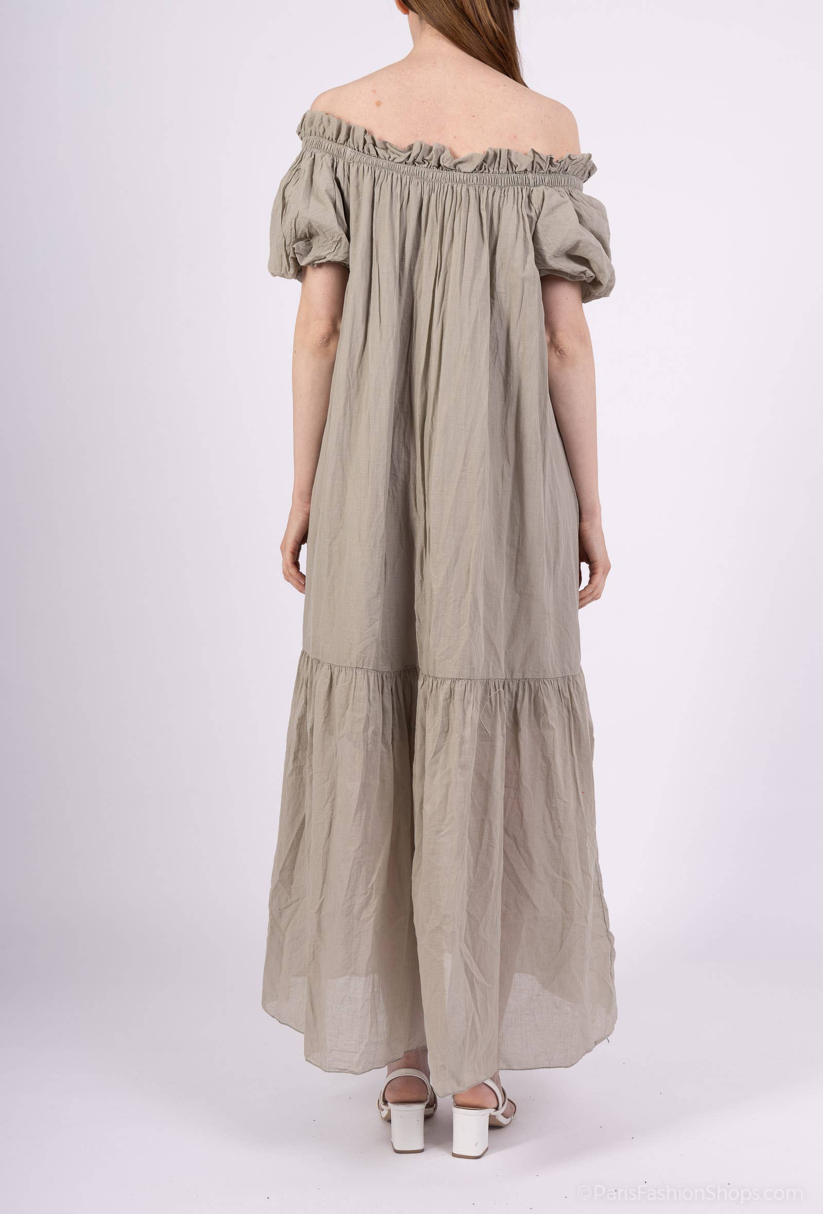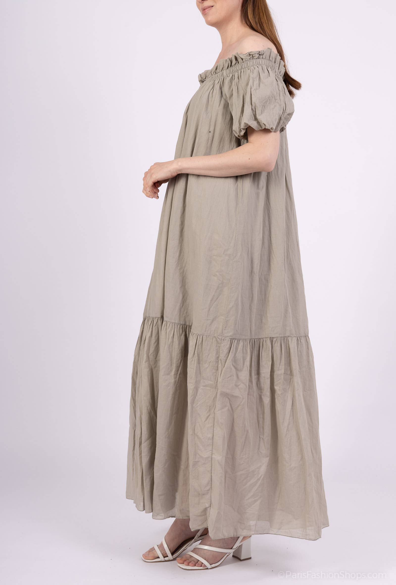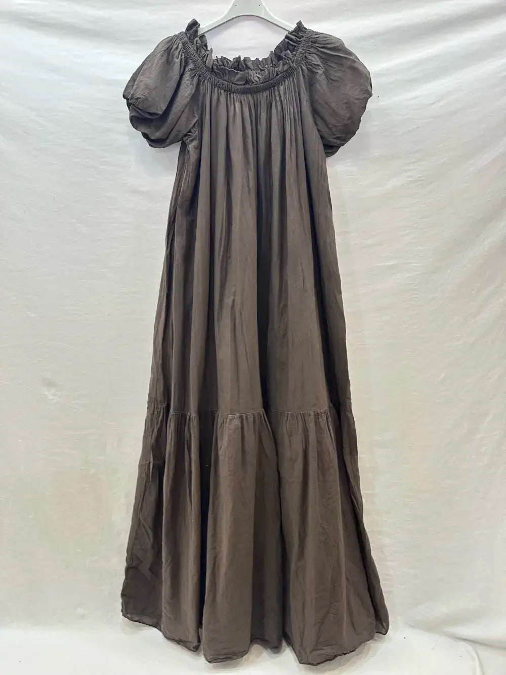 Lång klänning i bomullsvoile med volanger och foder, puffärm, en storlek, passar från storlek 36 till 42, längd: 130 cm. 100% bomull.
