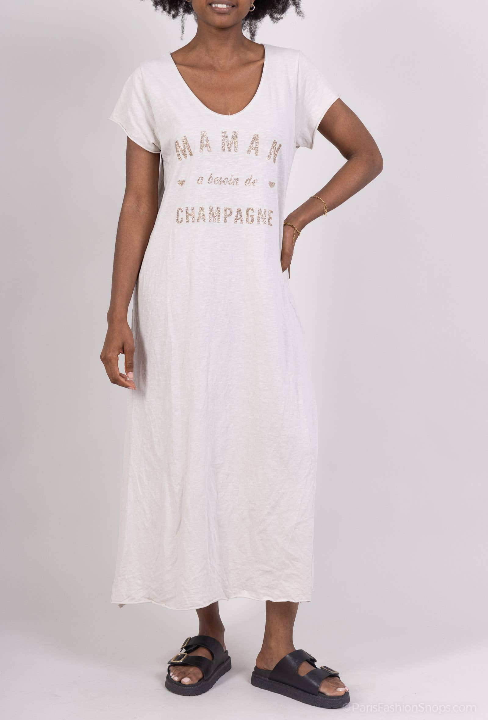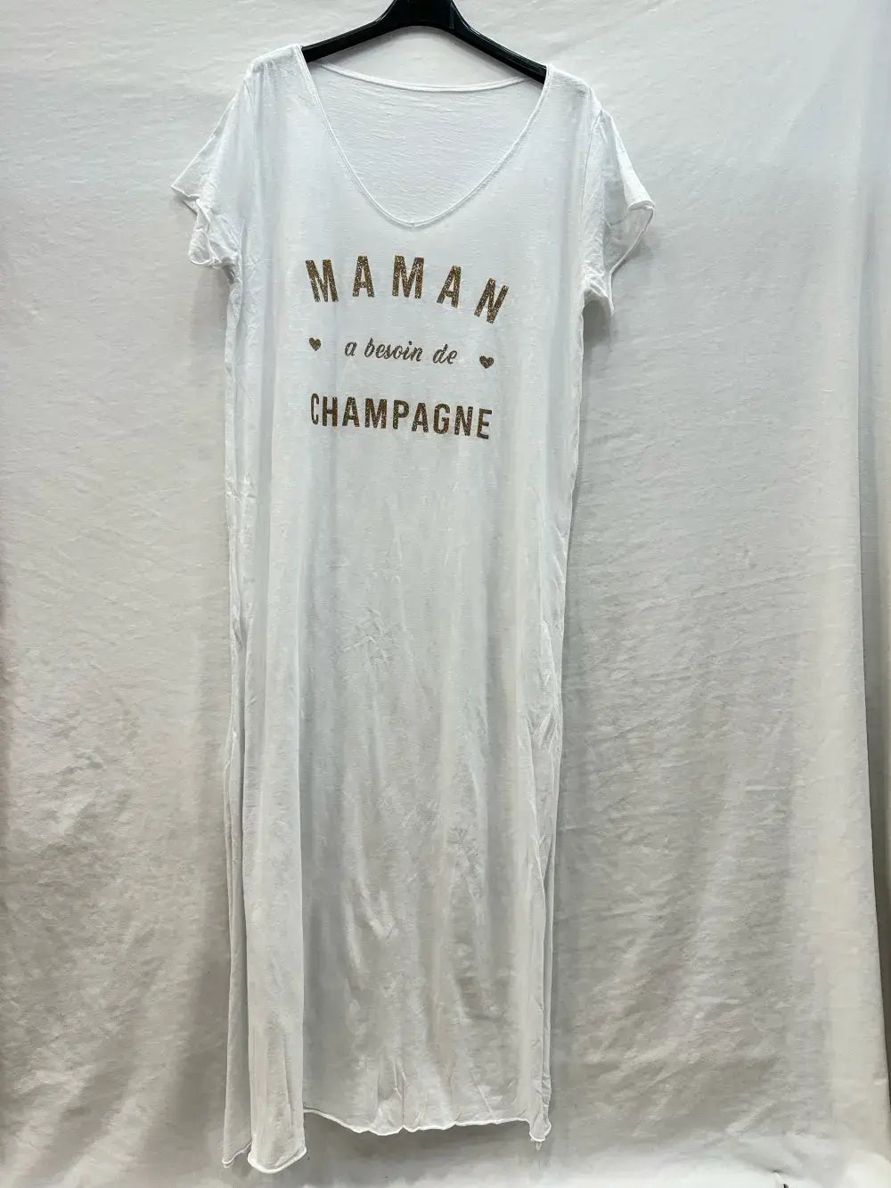 Lång klänning med slits och budskap, en storlek, passar från storlek 36 till 42. Längd: 124 cm. 100% bomull. "Mamma älskar champagne"