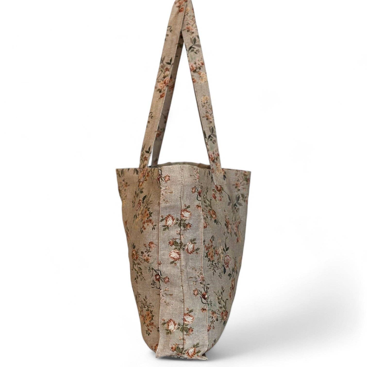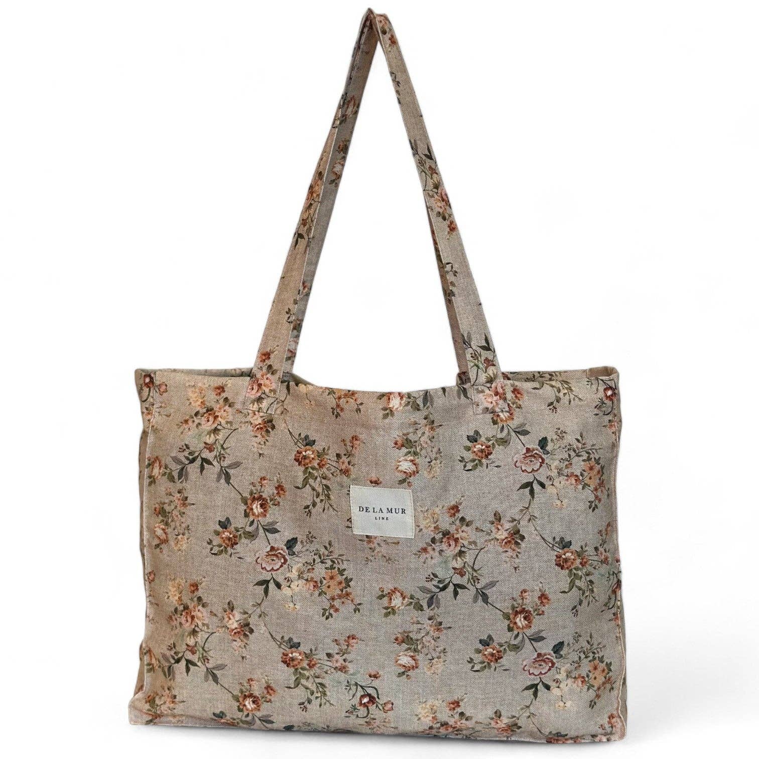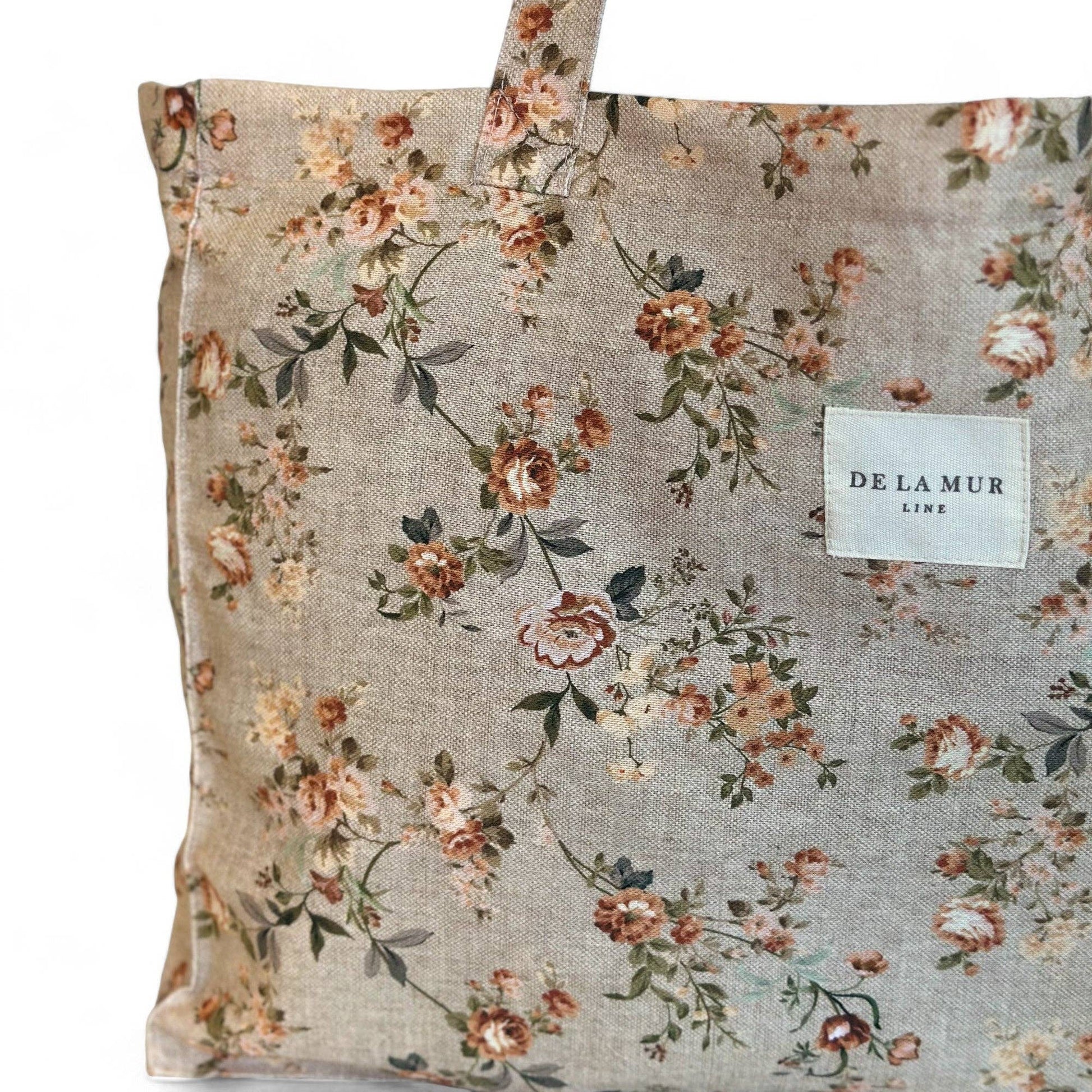 Rektangulär väska med axelhandtag. Med ett fint tyg med blommigt tryck i nyanser av panna. För korrekt underhåll är det lämpligt att tvätta det kallt för hand och inte använda en torktumlare.