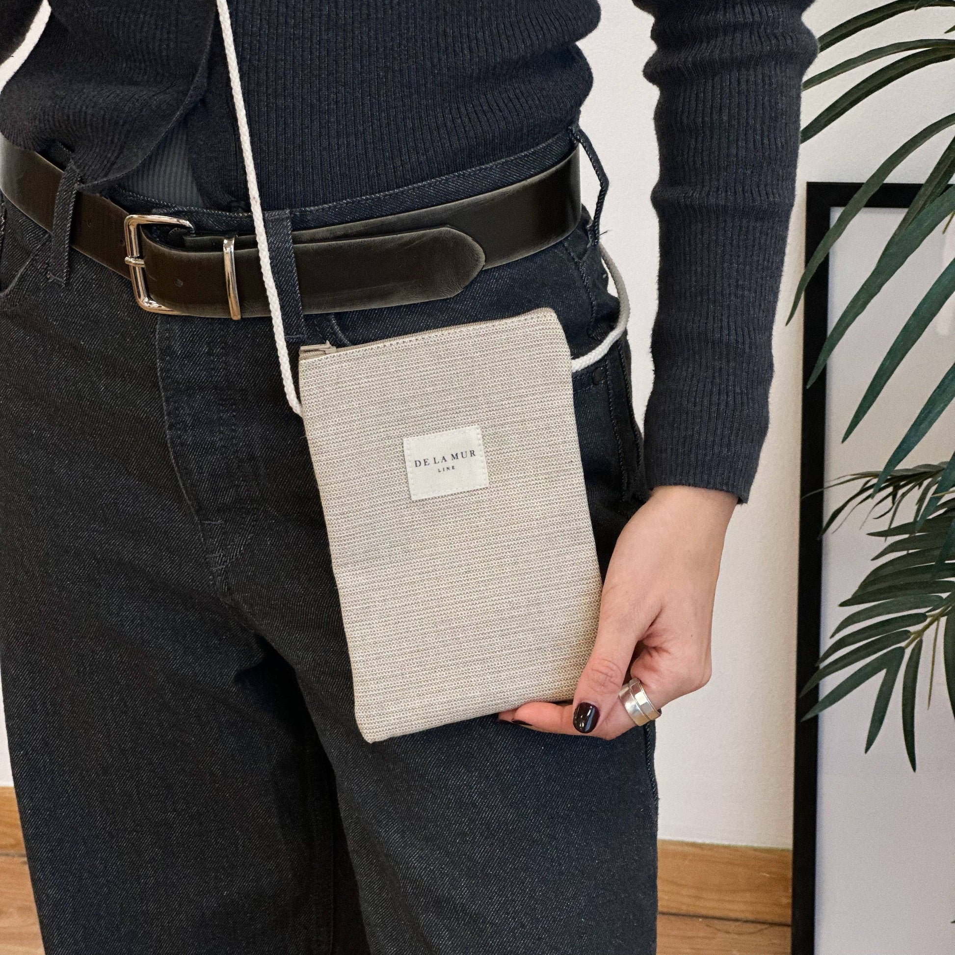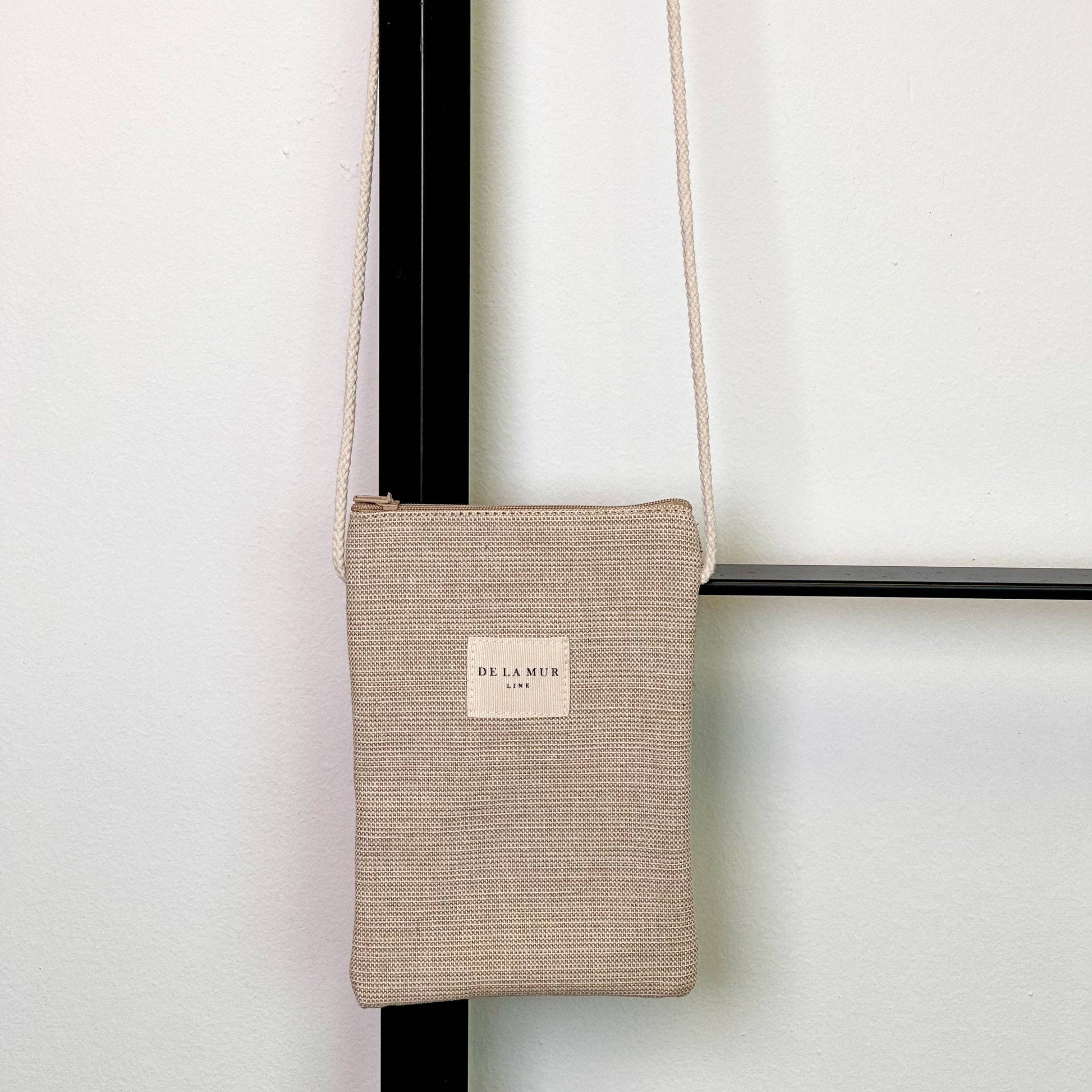 Mobil axelväska för bärning, med dragkedja på toppen och lång dragsko i ecru bomull. Med ett smidigt beige tyg. Fodrad med tjockt grått tyg på insidan. För korrekt underhåll är det lämpligt att tvätta det i kylan för hand och inte använda en torktumlare.