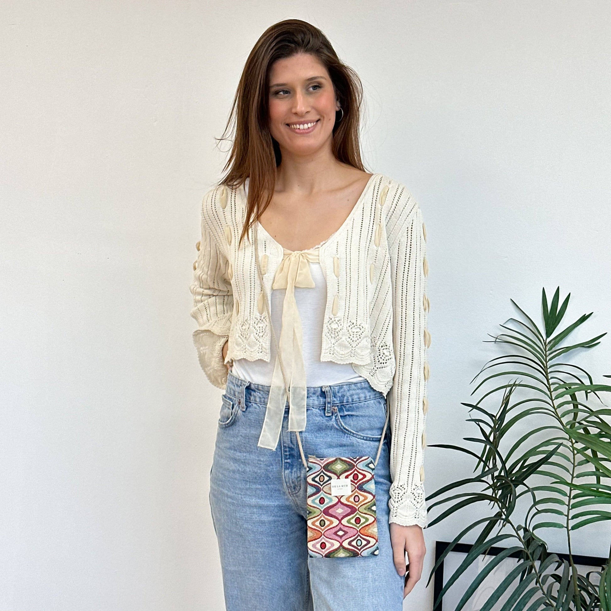 Mobil axelväska med dragkedja på toppen och lång beige bomullsdragsko. Med ett tyg med ett mångfärgat geometriskt tryck. Varje objekt kan ha en variation i mönstret, beroende på var delen klipptes. Fodrad med tjockt grått tyg på insidan. För korrekt underhåll är det lämpligt att tvätta det i kylan för hand och inte använda en torktumlare.