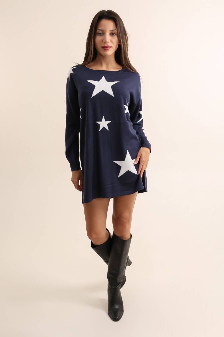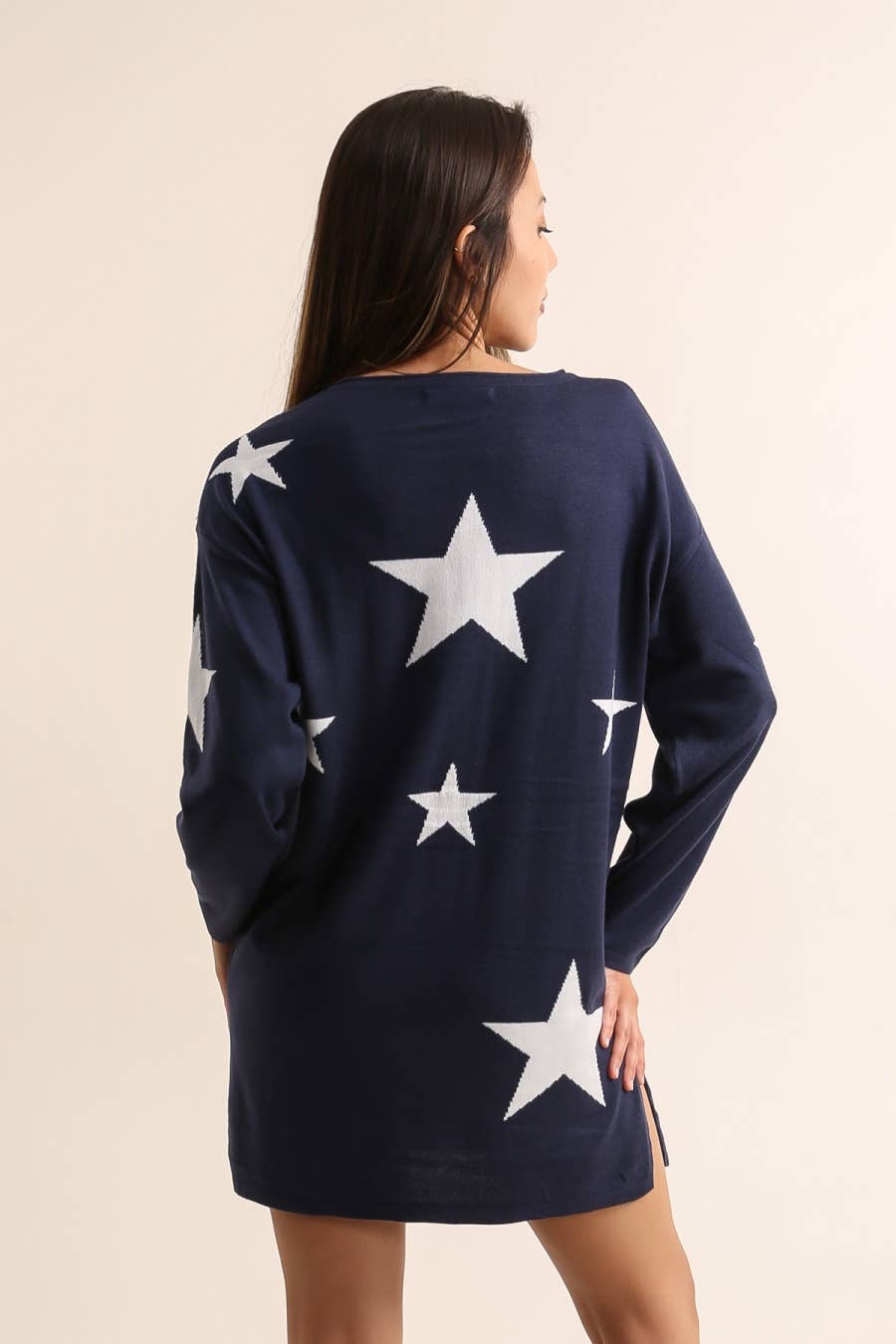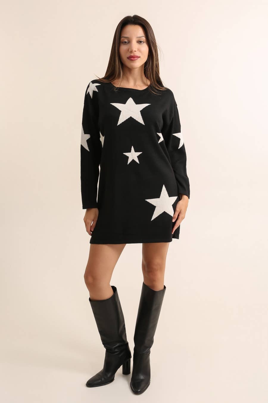 Överdimensionerad, mjuk stickad tröja med enfärgat mönster och invävda stjärnor framtill, båtringad.