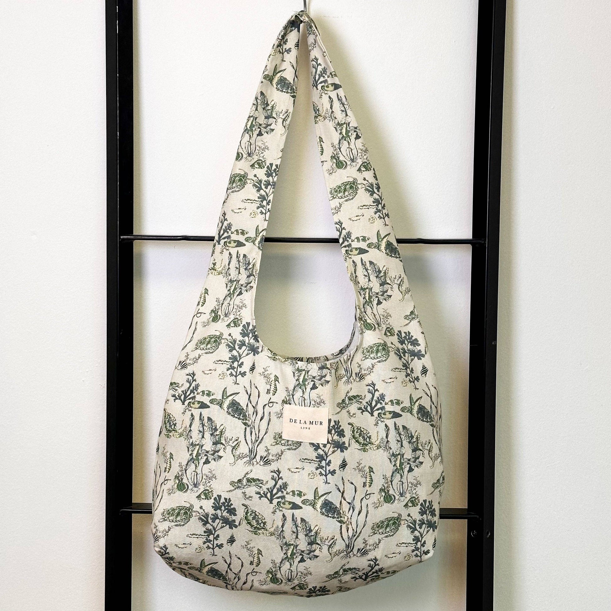Oval väska med axelremmar. Med tyg med marint tryck i nyanser av grönt och blått. För korrekt underhåll är det lämpligt att tvätta det i kylan för hand och inte använda en torktumlare.